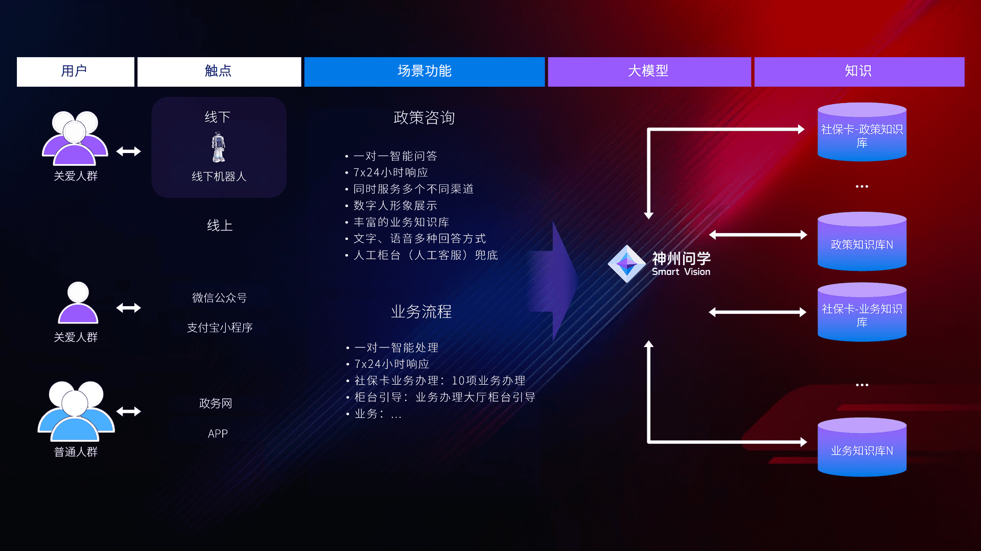 • 利用大语言模型+RAG技术,,,,支持多轮对话,,,,可识别多种同义词、、近义词,,,,精准理解关爱人群语义快速输出结果。。